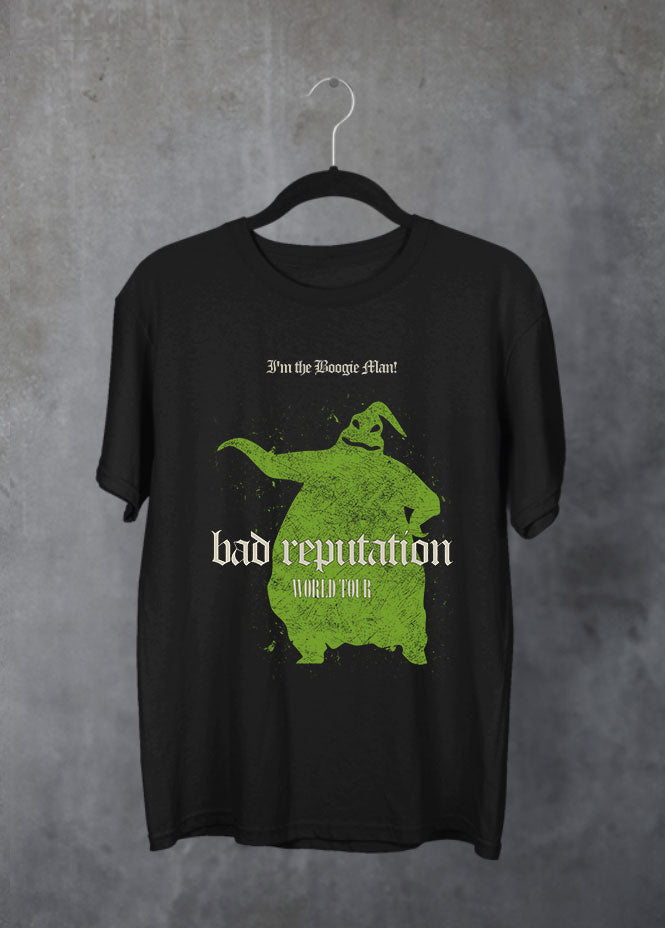 This Oogie Boogie design rocks the stage with a Villain band world tour vibe, stamped with the tour name Bad Reputation. It blends eerie casino flair with a rock and roll edge that makes it a standout for any Disney villain fan.