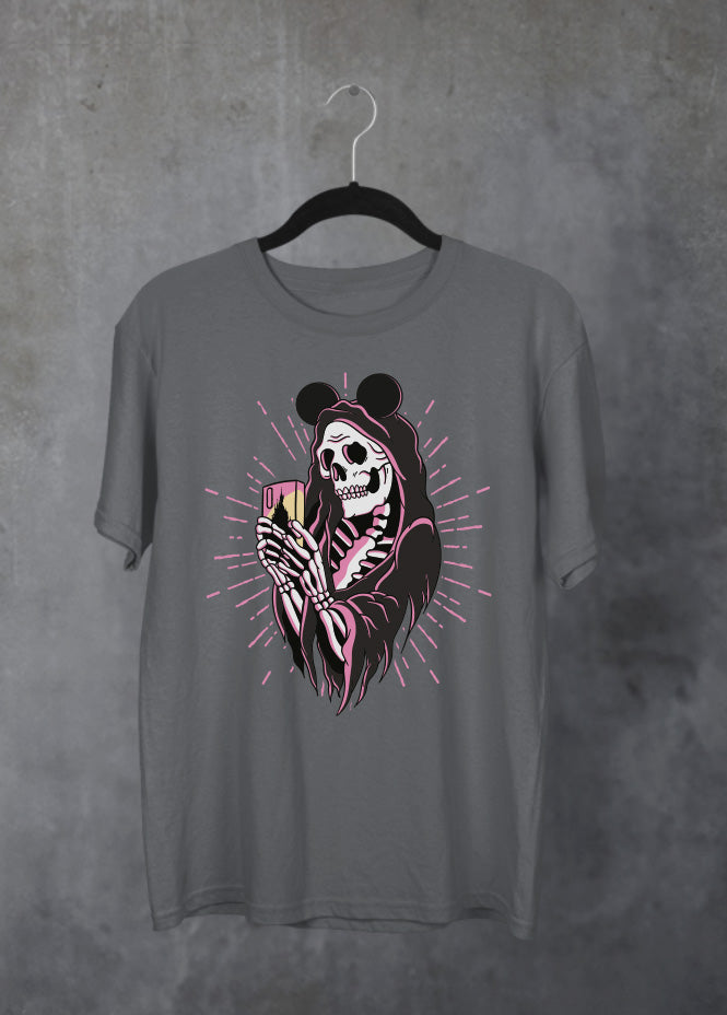 Capture the magic (and the mayhem) with this grim reaper design, complete with Mickey ears and a cheeky selfie moment from the afterlife.