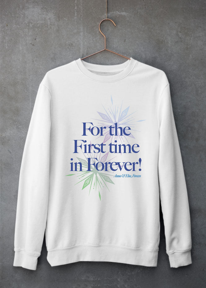 This Frozen inspired design features delicate snowflakes paired with the words First Time in Forever, capturing that hopeful rush of excitement that feels like doors finally opening and possibilities appearing all at once.